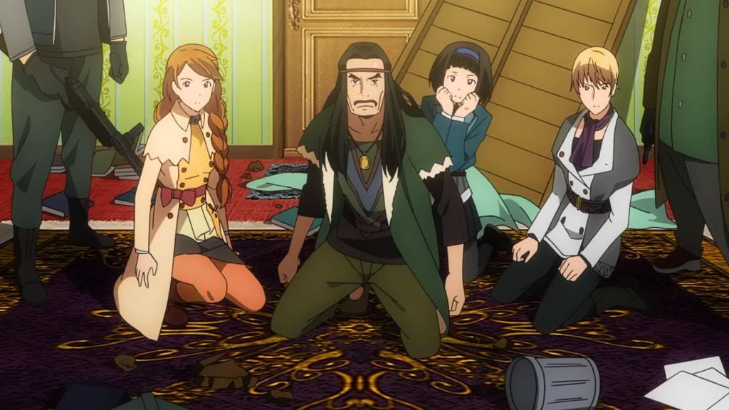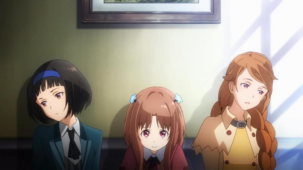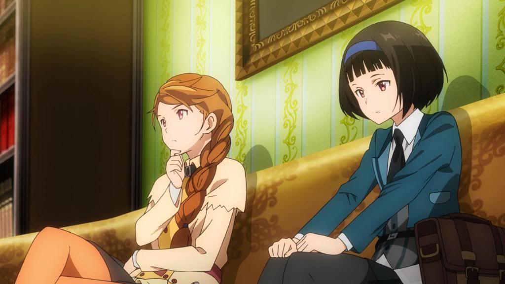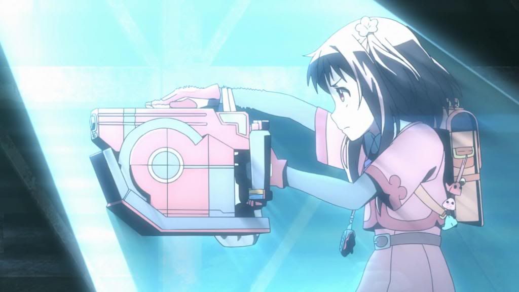 In that sense, we do learn some of the basics on what makes the sisters tick. They’re all descendants of Galileo Galilei, something their mother likes to remind them of when they’re disappointing her, but as Hazuki Ferrari (Shindou Kei), the onee-chan at law school, points out, they’re all doing their own things. She herself is bordering on early alcoholism (drinking during the day instead of being at class, ouch) as a result of her dissatisfaction with her studies and life at college, and she lives alone, separate from the family. Hazuki is also the provider of some of the comedic relief in this episode, especially when she self-importantly starts spouting out law information in dangerous situations, and she seems to be a bit out of it and irresponsible. The middle sister, Kazuki (Ookubo Rumi), is a socially withdrawn high school student who doesn’t care to participate in group projects but who harbors an unrequited crush on her fellow classmate, whom we’re not introduced to. She’s a rather sullen presence compared to her sisters, in that bored, rather snarky teenage way, and she expresses a desire to leave her home, which she presumably shares with her overbearing mother. Then there’s Hozuki (Hidaka Rina), the youngest sister and in some ways the star of the show. Unlike her sisters, Hozuki seems to be an engineering genius who has designed and built her own weaponry and technology. Despite being the smallest, she’s the most openly ready to counteract, and also in some ways the most removed from her family (excepting her father, whom she probably lives with). The Ferraris don’t seem particularly aware of Hozuki’s abilities, after all, and she’s the one who ends up coming to their very surprised rescue when things go a little insane.